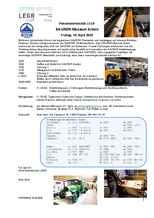 Voraussetzung, um beim Pensioniertenclub dabei zu sein, ist die Passivmitgliedschaft im LEGR. Wer wissen will was, wann und wo läuft, meldet sich über den untenstehenden Link zum Onlineformular oder per Email an geschaeftsstelle@legr.ch zum Pensioniertenclub LEGR an.